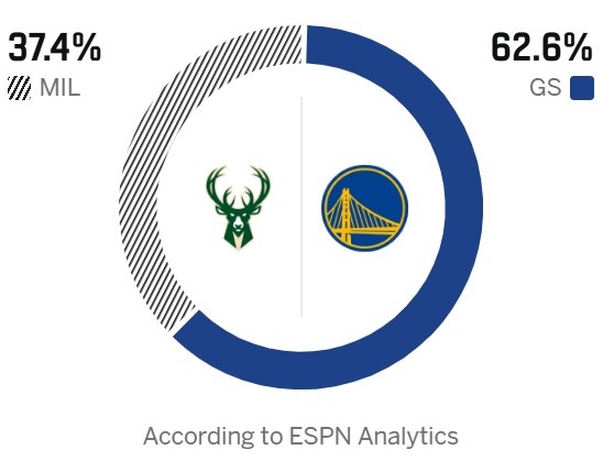 ESPN预测本场胜率,勇士62.6%占据大优势,雄鹿37.4%。